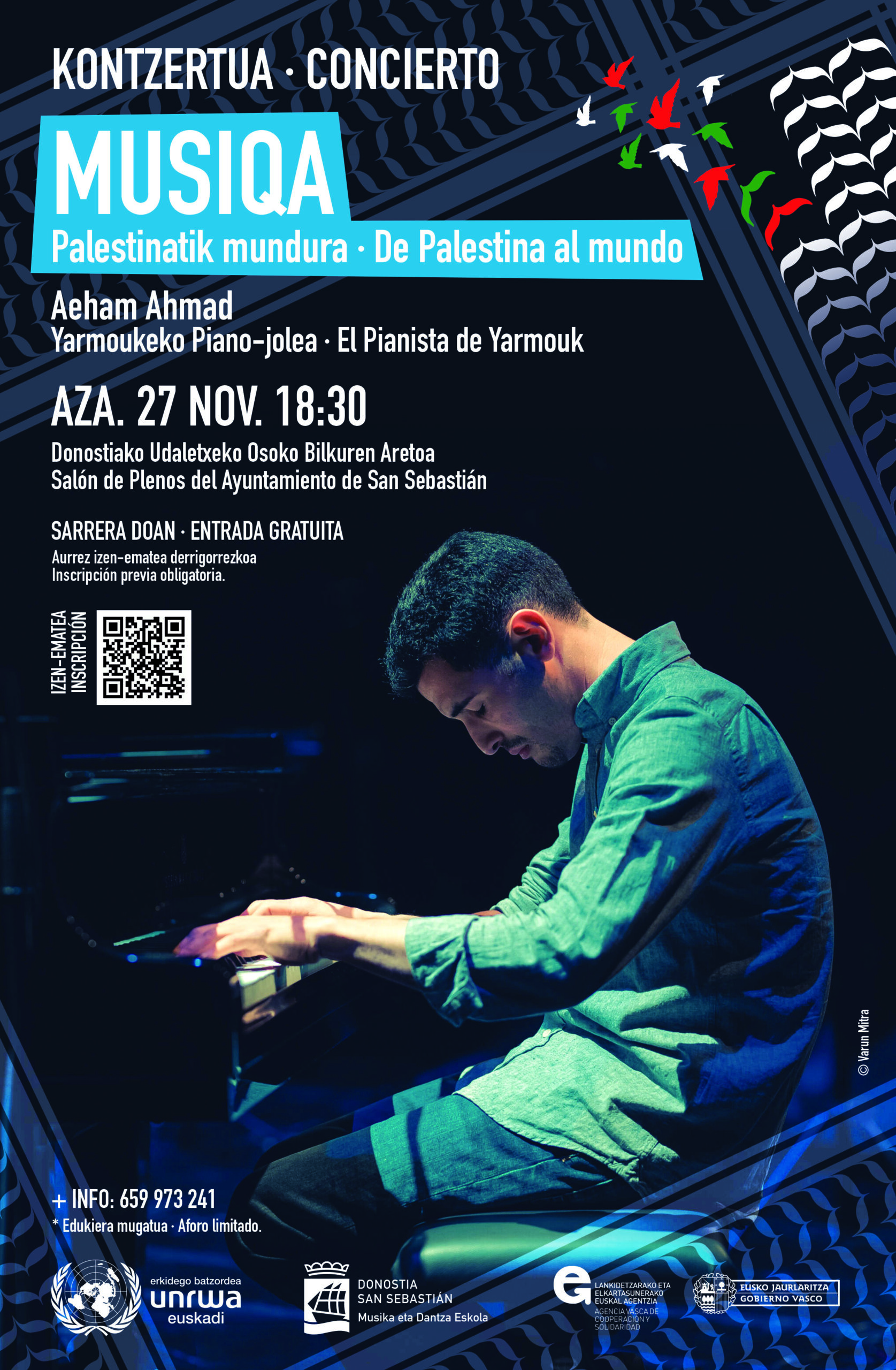 De la mano de UNRWA Euskadi y en colaboración con la Escuela Municipal de Música y Danza de Donostia, el pianista refugiado de Palestina en Siria Aeham Ahmad, conocido internacionalmente como El Pianista de Yarmouk, llega a Donostia para ofrecer un concierto en el que la música se convierte en voz, refugio y esperanza.