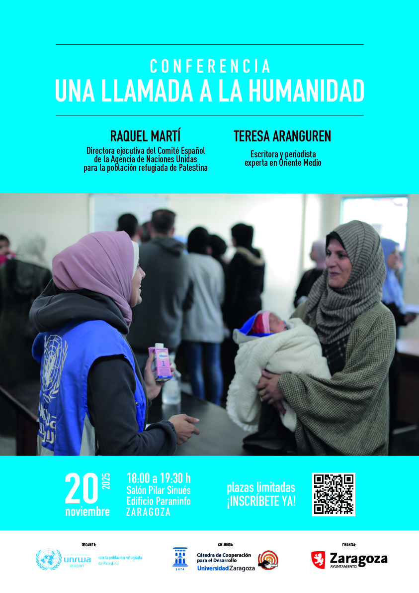 El próximo jueves 20 de noviembre, a las 18:00 h, en el Paraninfo de la Universidad de Zaragoza, te invitamos a la conferencia “Una llamada a la humanidad”, organizada por UNRWA Aragón en colaboración con la Cátedra de Cooperación para el Desarrollo de la Universidad de Zaragoza.
