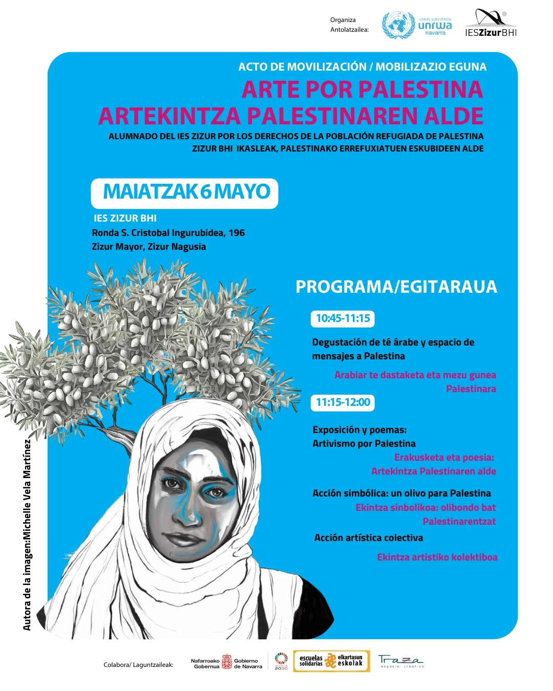 El próximo 9 de mayo, en la entrada del IES Zizur BHI, se ofrecerá un espacio de encuentro, arte y movilización en apoyo a la población refugiada de Palestina. Organizado por UNRWA Navarra junto al instituto, y con el apoyo del programa Escuelas Solidarias, este evento contará con actividades creativas, muestras culturales y momentos de encuentro y reflexión para visibilizar el compromiso del centro por los derechos humanos de esta población.